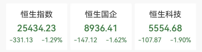 12月9日,市场情绪表现低迷,港股三大指数齐收跌。截至收盘,恒生指数跌1.29%,报25434.23点;恒生国企指数跌1.62%,报8936.41点;恒生科技指数跌1.90%,报5554.68点。
