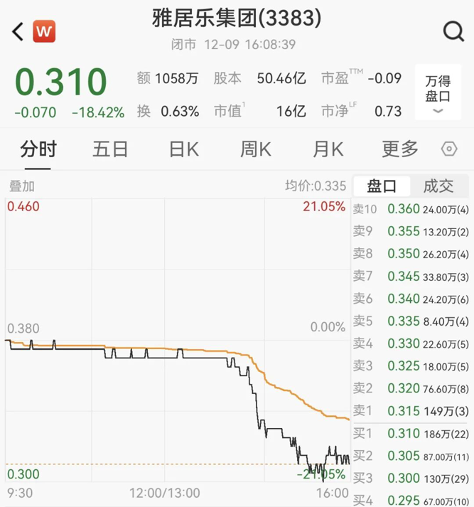 12月9日,雅居乐午后股价大跌,一度跌超21%至0.3港元,创历史新低,最终收跌18.42%,报0.31港元/股。