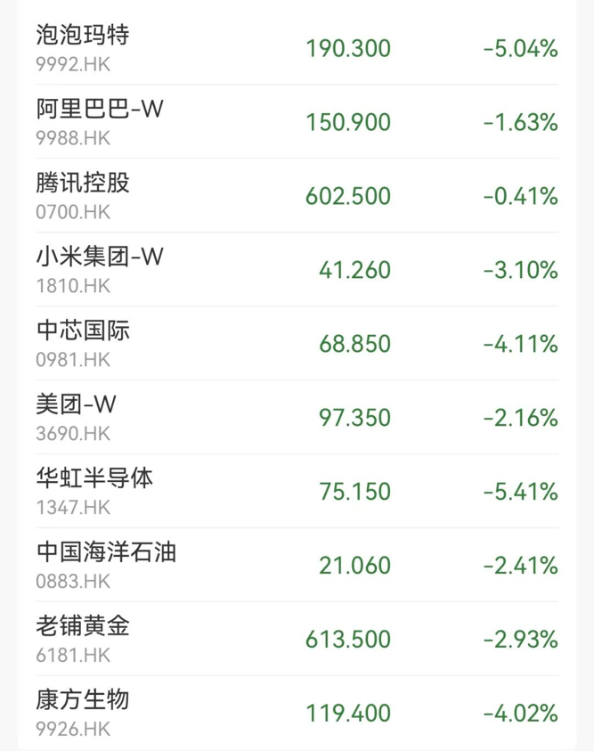 盘面上,大型科网股普跌,百度集团-SW、小米集团-W跌超3%,快手-W、美团-W跌超2%,网易-S、阿里巴巴-W、京东集团-SW跌超1%;重型基建股大跌,中国中冶重挫超21%,中铝国际跌超4%;半导体股下挫,华虹半导体跌超5%,中芯国际跌超4%;此前大热的泡泡玛特跌超5%,老铺黄金跌近3%。