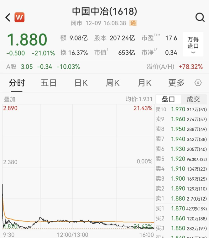 12月9日,中国中冶重挫超21%,领跌重型基建股。