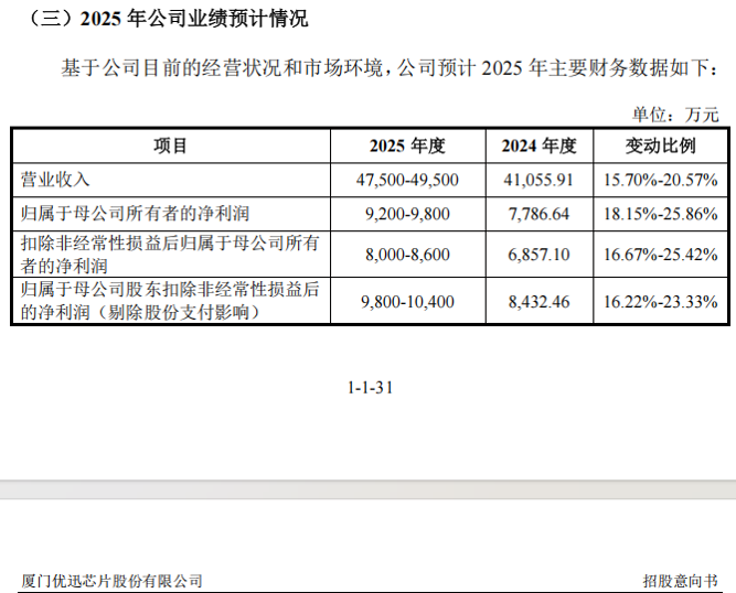 招股意向书显示,优迅股份预计2025年全年的营业收入为4.75亿元至4.95亿元,同比增长15.70%至20.57%;归母净利润为9200万元至9800万元,同比增长18.15%至25.86%。