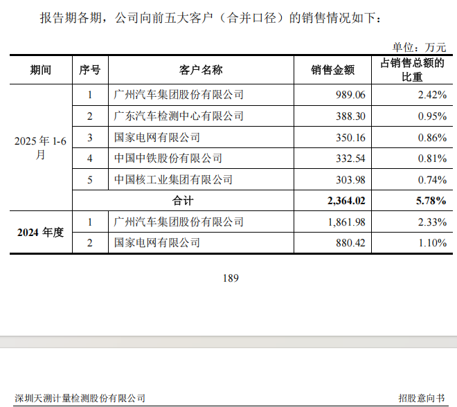 2025年上半年,天溯计量的前五大客户分别是广州汽车集团股份有限公司、广东汽车检测中心有限公司、国家电网有限公司、中国中铁股份有限公司、中国核工业集团有限公司。
