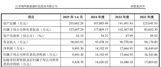 2022年至2024年及2025年上半年,锡华科技的营业收入分别为9.42亿元、9.08亿元、9.55亿元及5.80亿元,归母净利润分别为1.83亿元、1.77亿元、1.42亿元及9495.50万元。