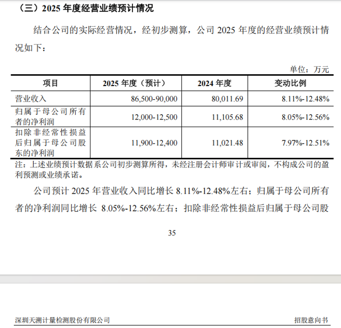 招股意向书显示,天溯计量预计2025年全年的营业收入为8.65亿元至9.00亿元,同比增长8.11%至12.48%;归母净利润为1.20亿元至1.25亿元,同比增长8.05%至12.56%。
